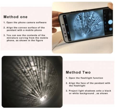 - Λέει «Σε αγαπώ» σε 100 γλώσσες χαραγμένες μέσω μικρογλυπτικής. Μπορείτε να το δείτε μέσα από κάθε τυπικό φακό κάμερας/smartphone! Προβάλετε την κεντρική καρδιά σε μαύρο φόντο με τον φακό της κάμερας για να δείξετε την αγάπη σας.