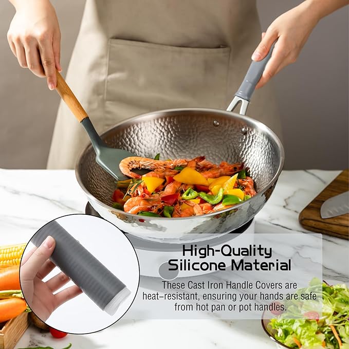 Τα καλύμματα σιλικόνης μας έχουν σχεδιαστεί για να είναι συμβατά με ένα ευρύ φάσμα μεγεθών λαβών κατσαρόλας και τηγανιού, καθιστώντας τα ευέλικτα και προσαρμόσιμα αξεσουάρ κουζίνας, ιδανικά για χύτρες από χυτοσίδηρο και τηγάνια με επίπεδο πάτο.