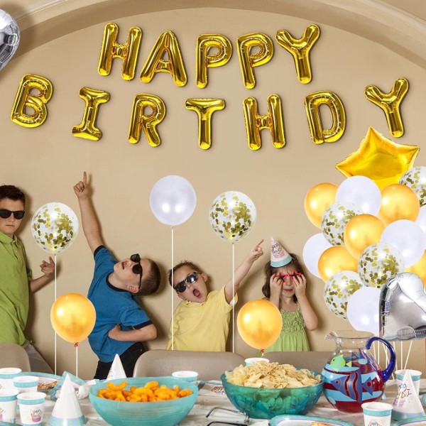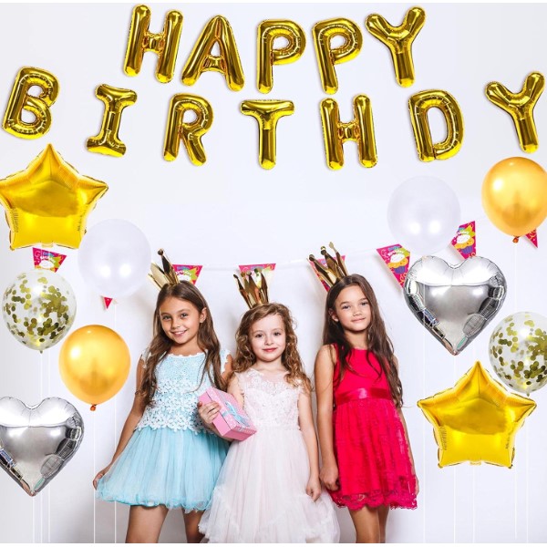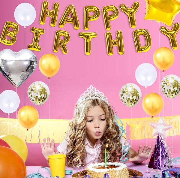 60 μπαλόνια διαφόρων χρωμάτων. 1x μπαλόνι σε σχήμα κορώνας. 2x μπαλόνια σε σχήμα αστεριού με πέντε αιχμές. 2x μπαλόνια σε σχήμα αστεριού με τέσσερις αιχμές. 1x κουρτίνα από αστραφτερές κορδέλες. 1x πανό Happy Birthday. 5x σετ πολύχρωμες διακοσμητικές φούντες. 1x διακόσμηση τούρτας Happy Birthday. Διακοσμητική κορδέλα, αξεσουάρ δεσίματος μπαλονιών, κόλλα και ταινία στερέωσης μπαλονιών.