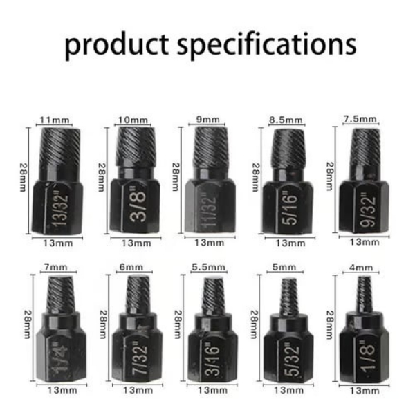 Το σετ εξολκέων μπουλονιών 10 τεμαχίων προσφέρει μια ολοκληρωμένη γκάμα μεγεθών, εξασφαλίζοντας ότι έχετε το κατάλληλο εργαλείο για κάθε εργασία εξαγωγής.