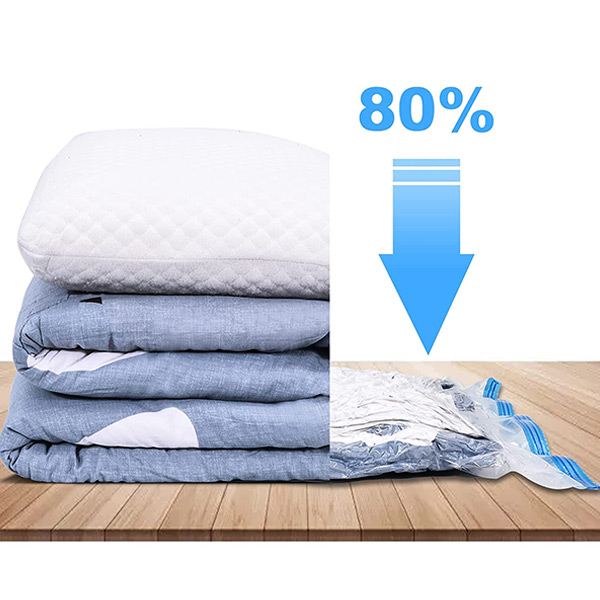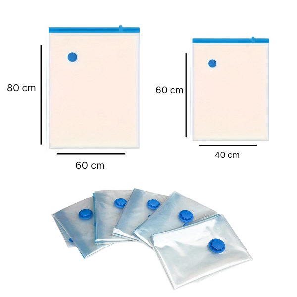 Ξεμείνατε από αποθηκευτικό χώρο; Εξοικονομήστε έως και 80% χώρο με τις σακούλες αποθήκευσης με κενό αέρα! Απλά συσκευάστε – σφραγίστε – και αφαιρέστε τον αέρα για να μειώσετε ογκώδη αντικείμενα όπως ρούχα, κουβέρτες και κλινοσκεπάσματα. Περισσότερος χώρος, λιγότερη ακαταστασία!